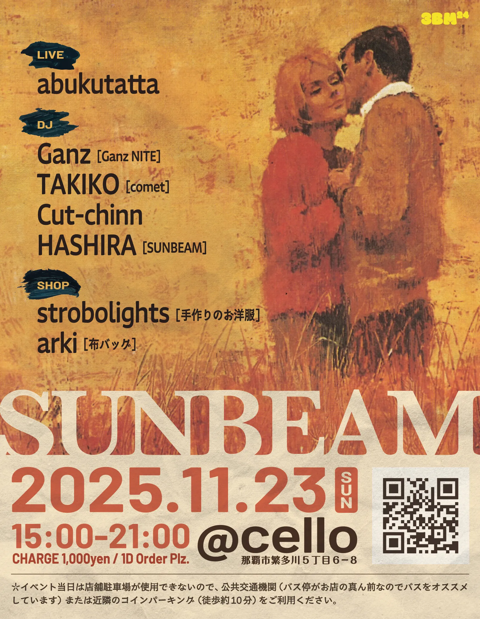 イベント当日は店舗駐車場が使用できないので、公共交通機関または近隣のコインパーキング(徒歩約10分)をご利用ください。